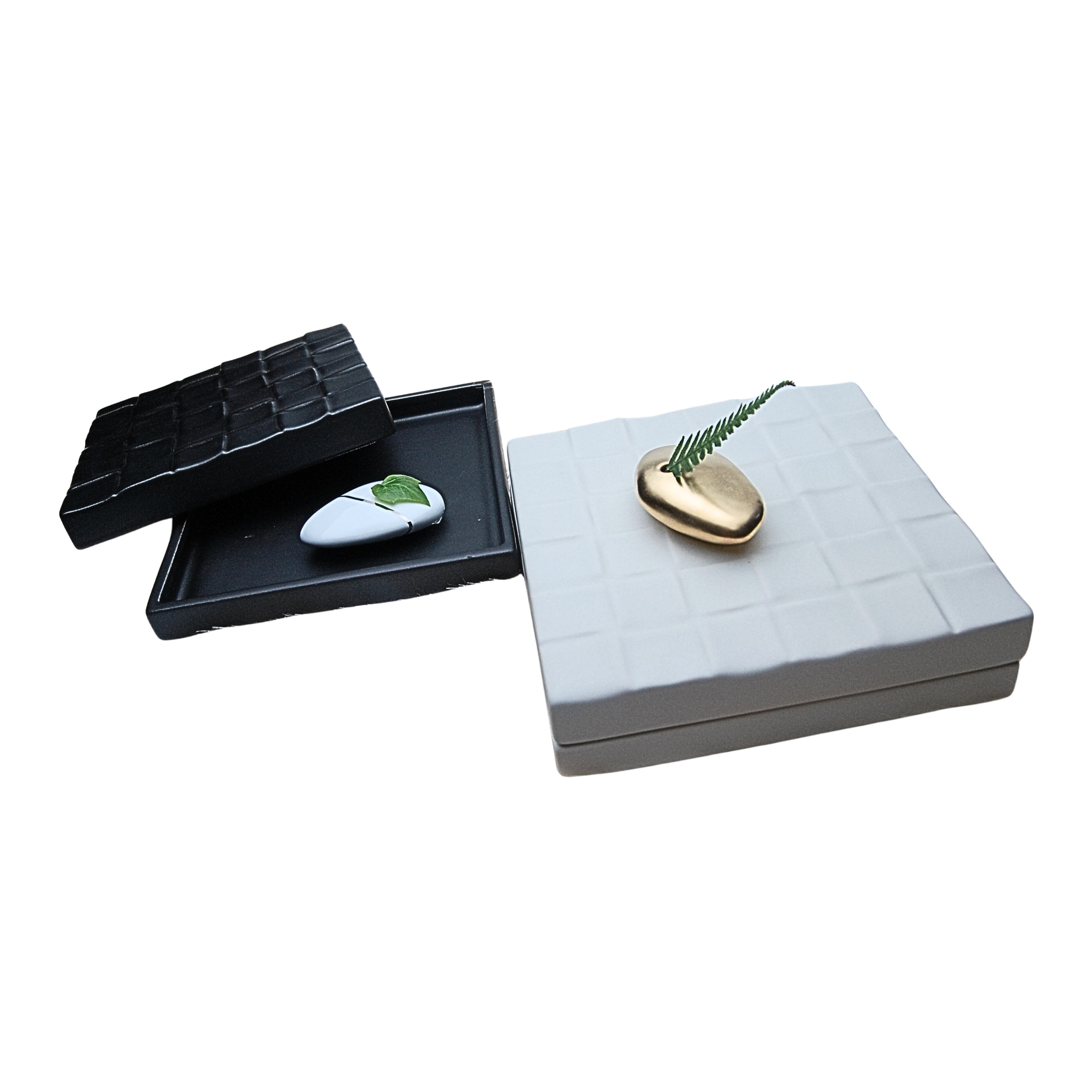 マットブラックに塗装された陶磁器製のスリムボックス。フタ付きの正方形で、ジュエリーや写真など薄手のアイテムを美しく収納。空間に温かみと静かな存在感を添える店舗装飾アイテムです。